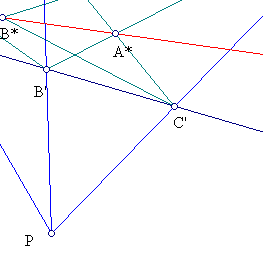 Consider three points on line a and three on b and join them as shown. Then the intersection-points A*, B*, C* of the joining lines are contained in a line c.